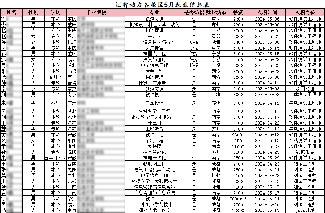 匯智動(dòng)力各校區(qū)5月就業(yè)情況